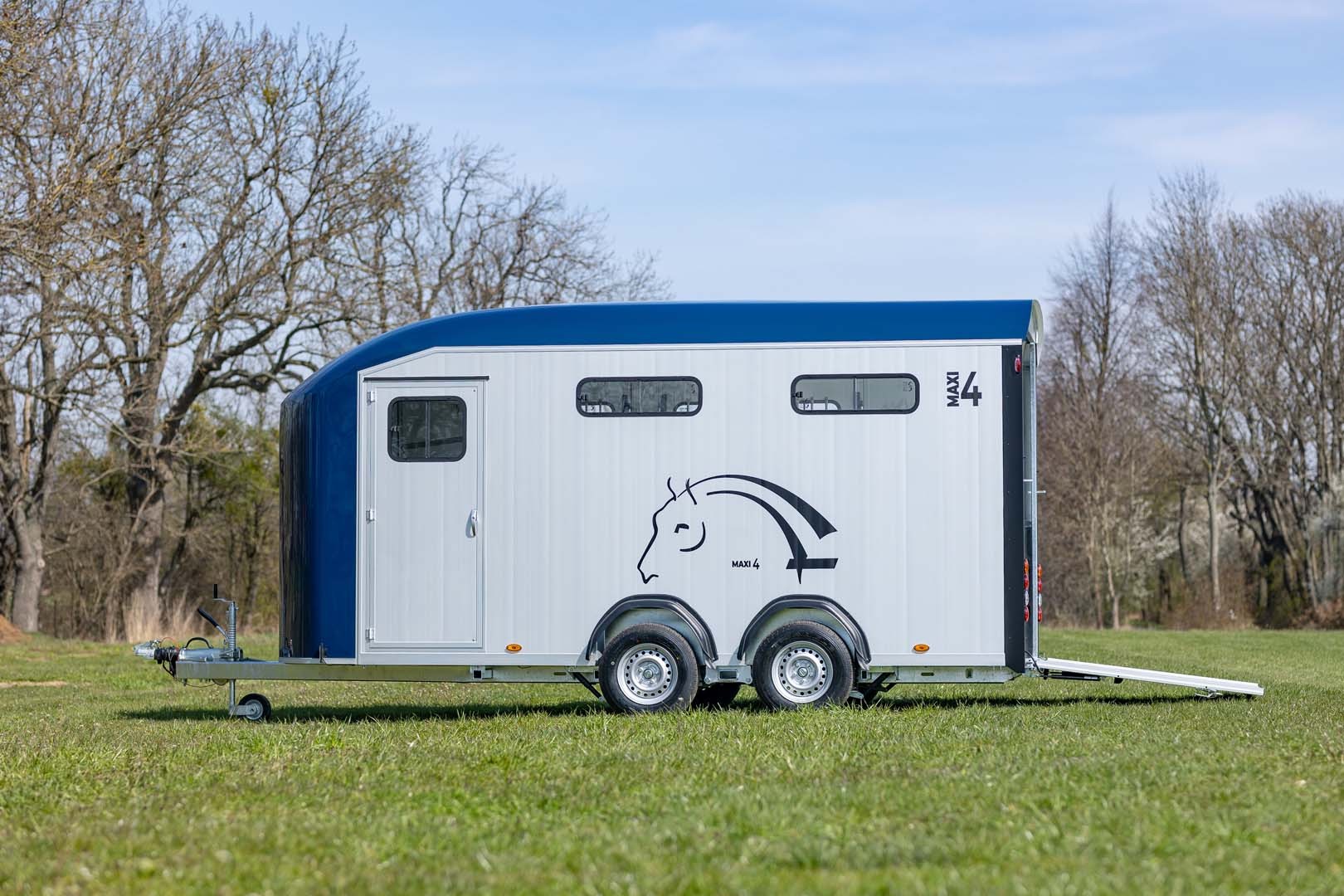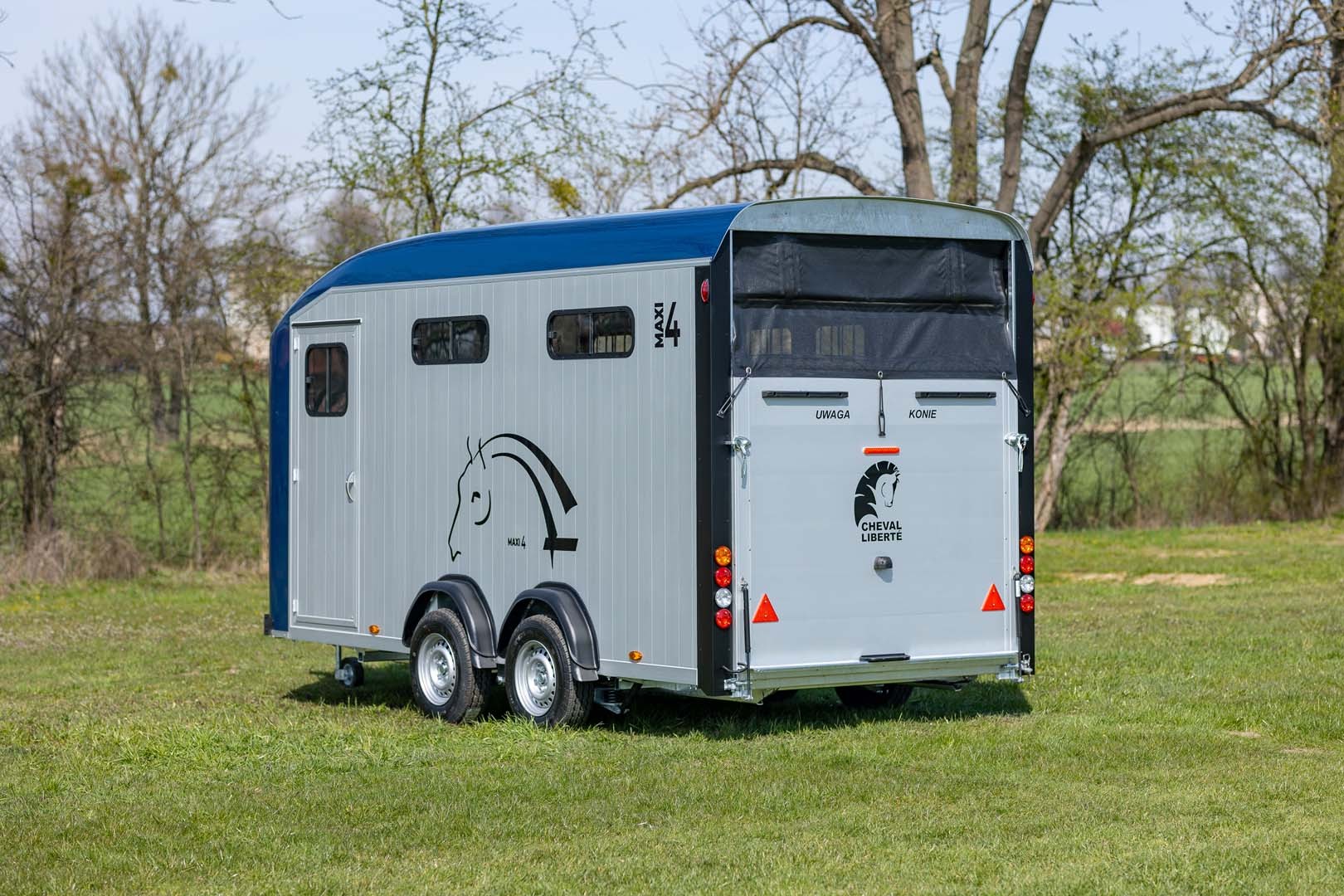 Der Cheval Liberté Maxi 4 ist ein geräumiger Pferdeanhänger, der den sicheren Transport von bis zu vier Pferden in Schrägstellung ermöglicht. Zu den praktischen Features zählen das flexible Rampe/Tür-System am Heck, ein Frontausstieg auf der rechten Seite sowie eine großzügige Sattelkammer mit Sattel- und Trensenhaltern. Mehrere Schiebefenster und Dachlüfter sorgen für optimale Belüftung und Komfort während der Fahrt.